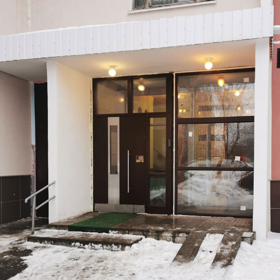 Остекление подъезда многоквартирного дома. Белые и ламинированные конструкции.